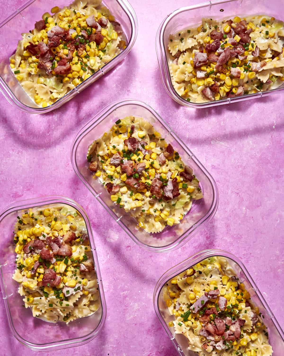 I use whatever pasta I fancy but love the fork-feel of farfalle with this recipe. Avoid super long pasta like spaghetti as it’s a bit awkward in a meal prep container. Something with ridges or tubes is ideal for catching that creamy corn pasta sauce if you want to get more particular.