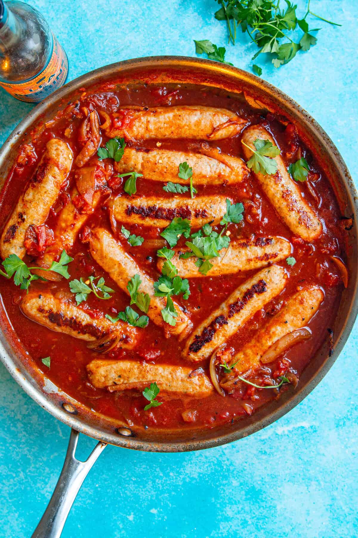 Refrigerator: Let the mix cool completely before sealing it in an airtight container for up to 3 days. It’s great because the savoury sausages marinate in the sauce and get even tastier.