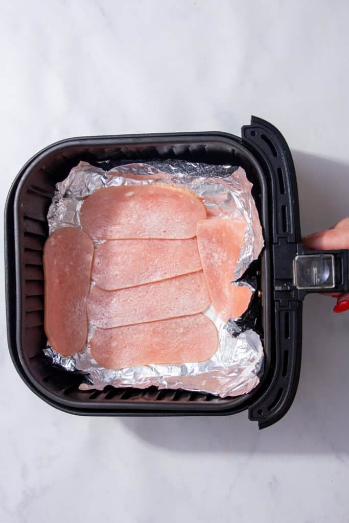 Step 1: Line your air fryer basket with foil and add the turkey bacon, spraying with a bit of oil. Cook for 10 minutes at 200°C/400°F.