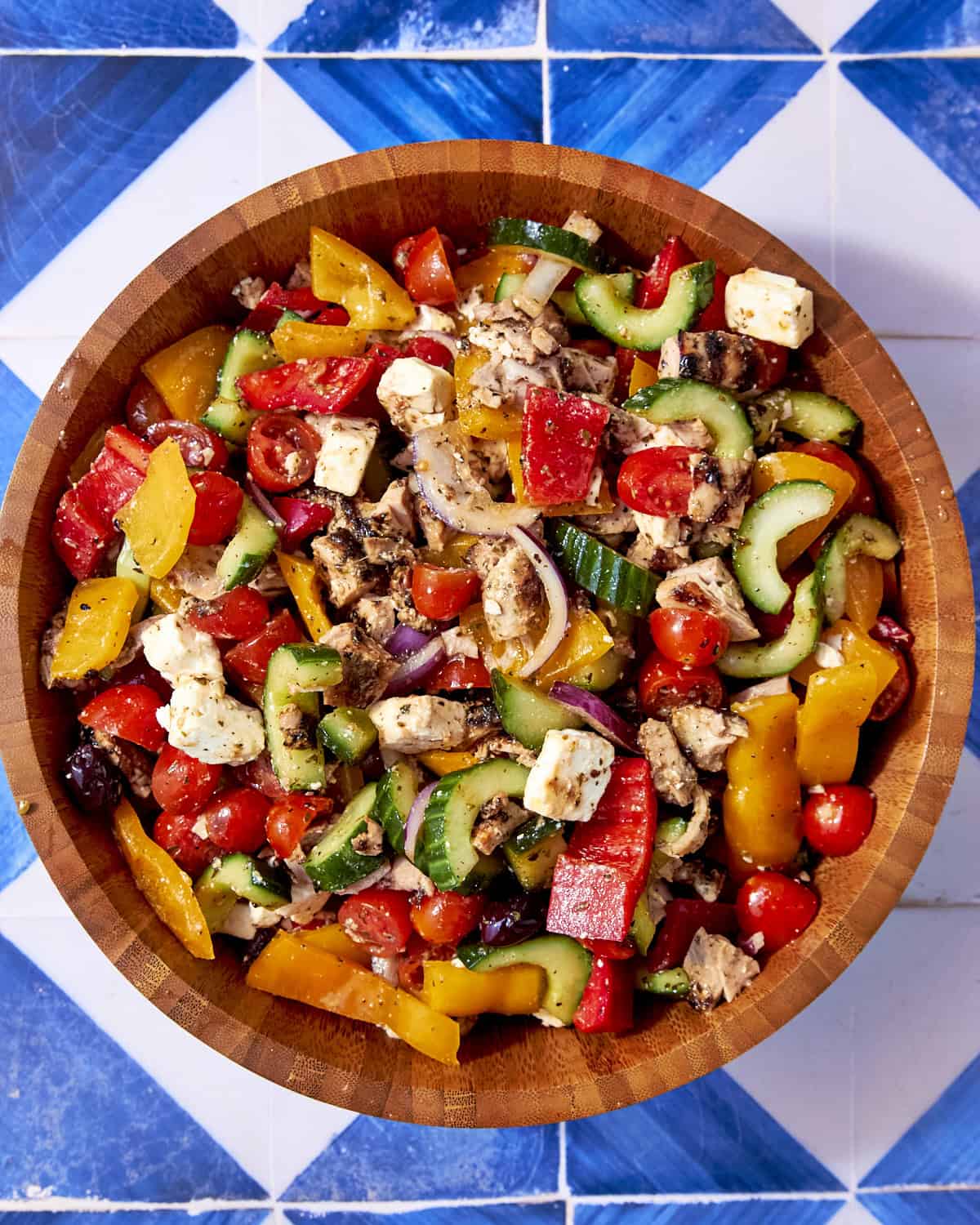 3. Once your chicken is cooked and chopped, add it to the bowl along with the diced cucumbers, peppers, plum tomatoes, feta, and olives, tossing everything until well coated (Image 3).