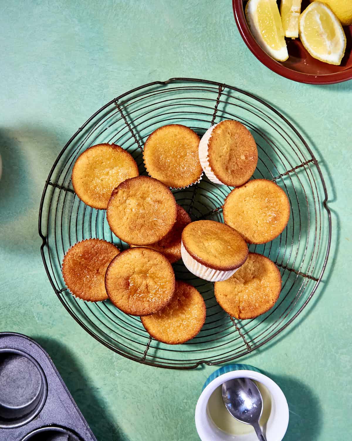 Don’t over-stir the drizzle as you want some of the sugar granules to stay undissolved so they crystallise on top as the lemon yogurt muffins cool. That’s where the slight crunch comes from in this recipe.