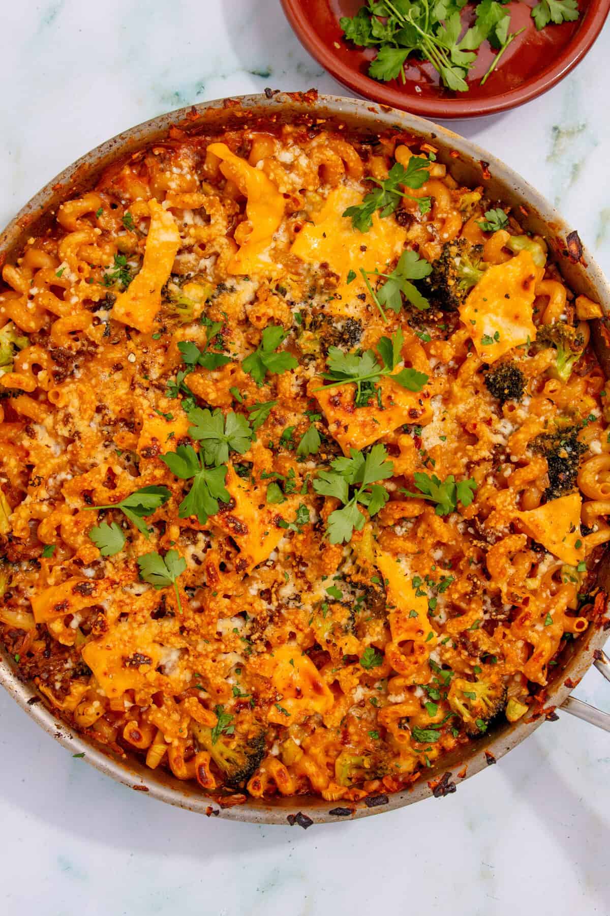 This cheesy mince pasta is my ultimate recipe for a busy day. I know you want comfort food on a Tuesday, but you don’t want a mountain of dishes afterwards! Honestly, if you’re looking for simple mince and pasta recipes that taste amazing and don’t require heavy cleanup, this is the one. Serve it with Crispy Smashed Broccoli with Parmesan for the easiest weeknight meal.