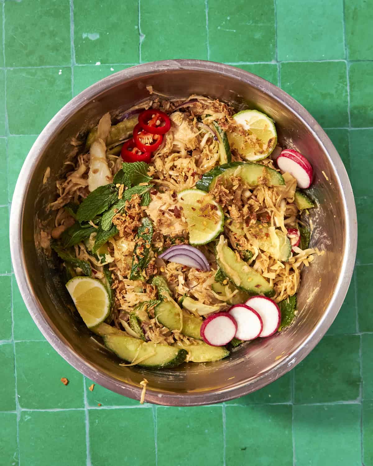 Step 4: Add the shredded cabbage, cucumber, radishes, cooked shredded chicken, red onion, mint, peanuts, and crispy onions to the bowl, then toss everything together until coated.