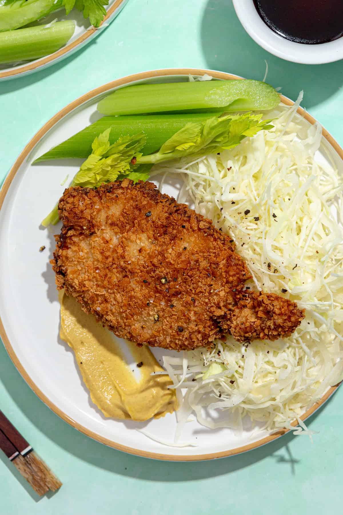 Step 6: Serve up with your cabbage salad, soy sauce and mustard.