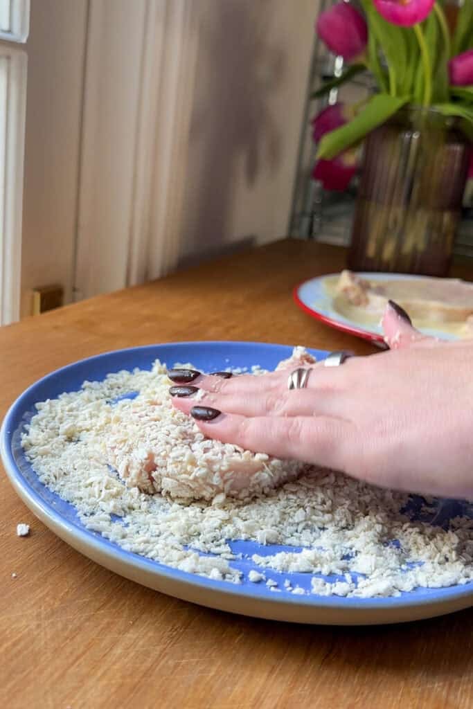Step 2: Firmly press the breadcrumbs to help them bind to the pork loins.
