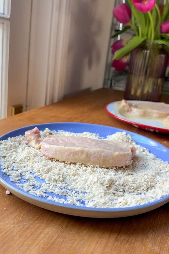 Step 1: Dredge your pork loins in the wet-mix, then the panko breadcrumbs.